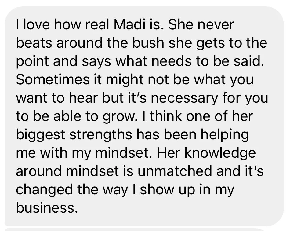 “My time spent with Madi has been more than I could have ever asked for. She truly goes above and beyond for her clients. I went through some really tough times over the 12 weeks I worked with her and she gave me advice and support that helped me work through some really difficult things. My business is thriving with the new tools I have implemented since working with Madi. I am excited to continue working with her into the future. I cannot recommend her enough to business owners. She has incredible knowledge around business and to top it all off she’s a kind and genuine person who wants nothing but the best for her clients".