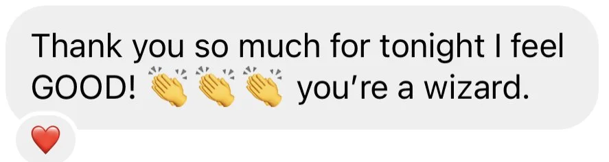 Text message with red heart emoji, saying "Thank you so much for tonight I feel GOOD! 👏👏👏 you're a wizard."