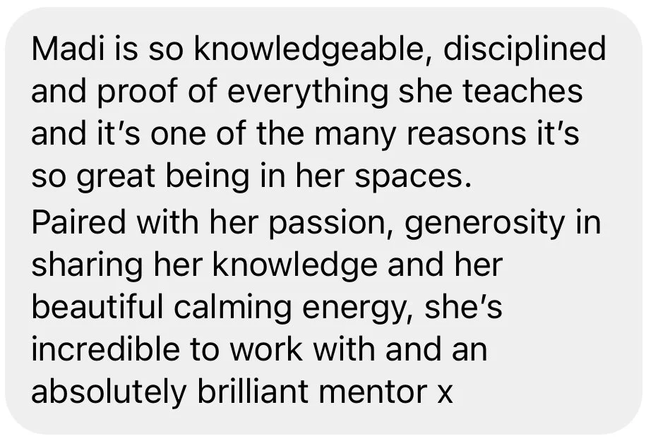“Madi is no bullshit. No judgement. No bias. All love. Genuine. Supportive. Real. There’s no doubt in my mind I’ll continue to grow, thrive and succeed with her in my corner.”