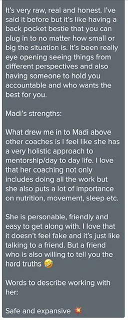 Text review about a coach named Madi, praising her holistic approach to mentorship. Emphasizes Madi's focus on nutrition, movement, sleep, and her personable and honest nature. Describes working with her as safe and expansive.