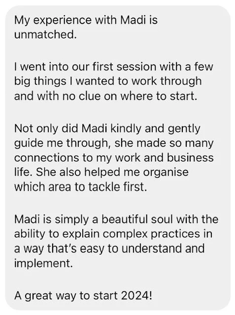 “I had the pleasure of joining The Mind Game series with Madi. I had never considered doing anything like this before, but something felt right about this program. Honestly, I would recommend that everyone experiences this program firsthand. Madi is so generous with her time and knowledge. This program really shifted my mindset, especially around self worth and people pleasing. Madi was the perfect balance of kindness and practicality. She was honest, yet genuine and supportive. I was also blown away with the value that this course gave, especially all the bonus content. I can’t wait to work with Madi in the long term. I highly recommend Madi Banson Coaching to anyone!”