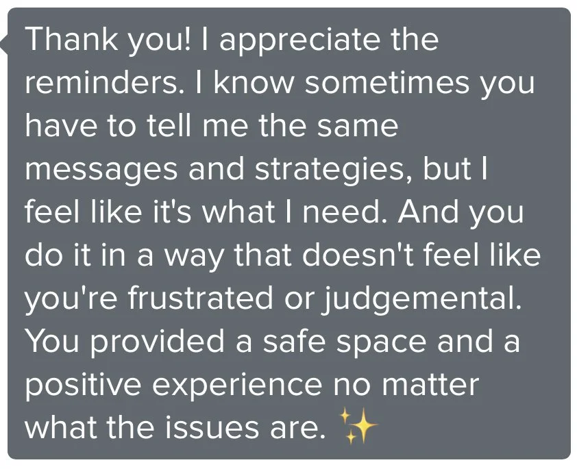 Screenshot of a text message expressing gratitude for reminders, emphasizing the non-judgmental and supportive nature of the interaction. Includes sparkling star emojis.